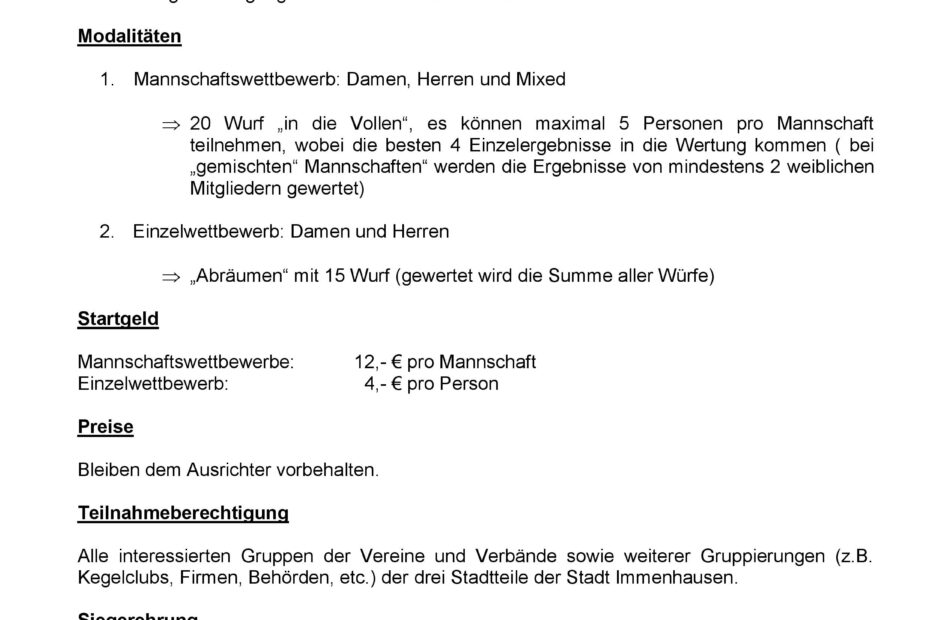 Vom 01. bis 07. November 2025 lädt die Abteilung Kegeln der TSV 1889/06 Immenhausen e. V. herzlich zum traditionellen Mannschafts- und Einzelpokalkegeln auf der Georg-Stüssel-Kegelbahn… Weiterlesen »Einladung zur 26. Kegelwoche der Abteilung Kegeln