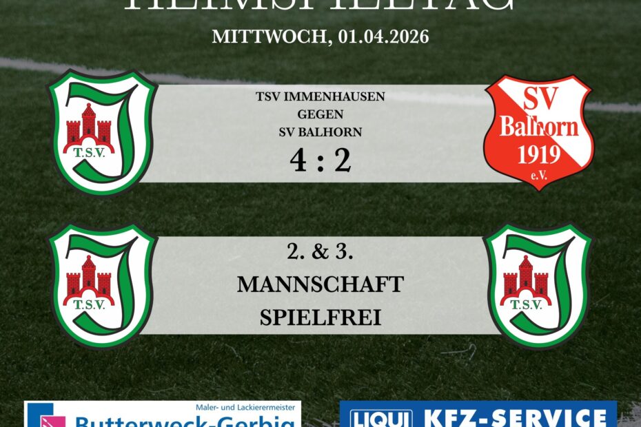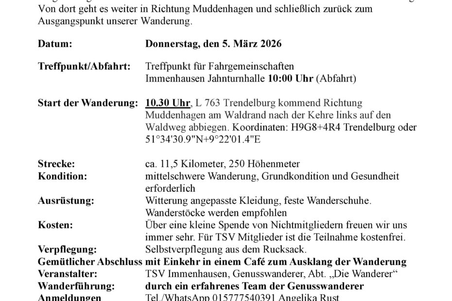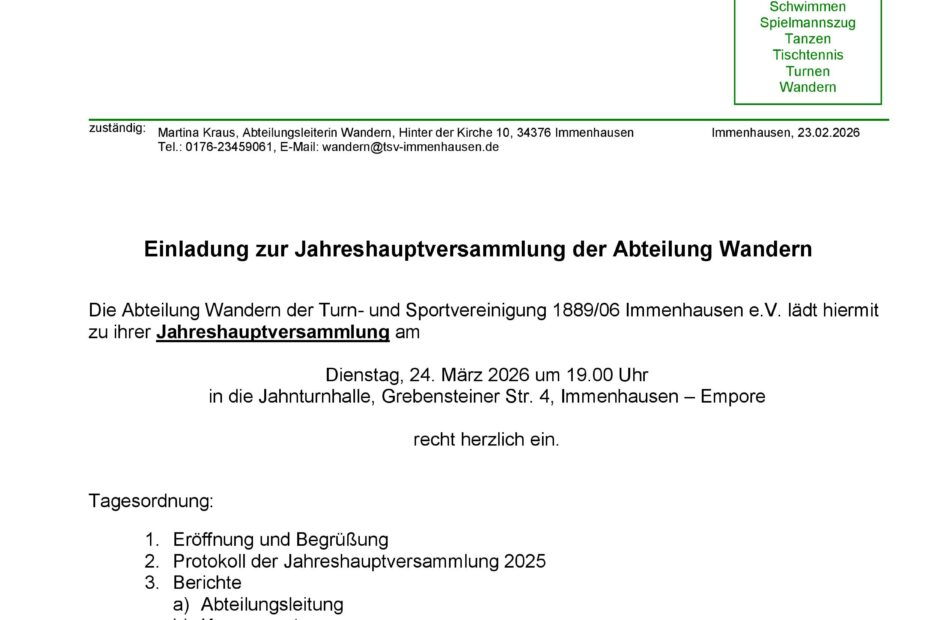 Bei uns findest Du neben den klassichen „nordhessischen“ Sportarten wie Fußball, Handball, Tischtennis oder Turnen auch Darts, Judo, Freizeitsport und Tanzen. Ebenfalls kannst du dich bei Kegeln, Leichtathletik, im Spielmannszug oder beim Wandern aktiv betätigen. Und da Immenhausen ein Schwimmbad hat, gibt es bei uns natürlich auch eine Abteilung Schwimmen. Falls dir diese Abteilungen noch nicht zusagen, gibt es noch zahlreiche Fitness- und Gesundheitskurse wie Zumba, Power Pump, Yoga oder Bodyworkout. Möchtest du dein Rehaprogramm bei uns absolvieren sprich uns in der Geschäftsstelle (Telefon: 05673-3400) an oder schreibe uns per E-Mail: .