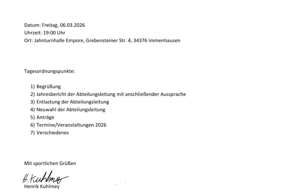Ein karnevalistisches Wochenende liegt bereits hinter uns – und das nächste steht schon vor der Tür.Aufgrund unserer Karnevalsveranstaltungen bleibt die Geschäftsstelle der TSV 1889/06 Immenhausen… Weiterlesen »Karnevalistische Pause der Geschäftsstelle