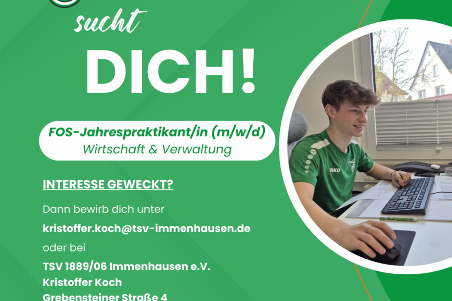 Die TSV 1889/06 Immenhausen e.V. sucht für die Jahnturnhalle eine zuverlässige Vertretung in der Raumpflege. Zeitraum:30.03. – 29.05.2026 Rahmenbedingungen:• Beschäftigung auf Minijob-Basis• ca. 7–8 Wochenstunden•… Weiterlesen »Stellenanzeige – Vertretung Raumpflege (m/w/d)