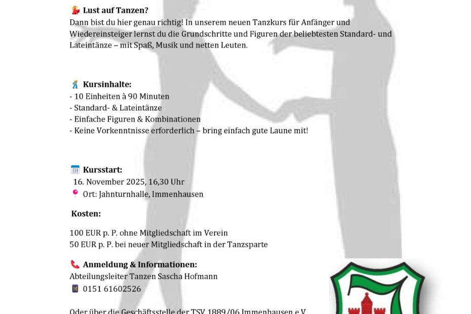 Am 2. November lädt euch die Abteilung Tanzen der TSV Immenhausen herzlich zu ihrem diesjährigen Tanz-Café in die Jahnturnhalle ein. Ab 15:00 Uhr erwartet euch… Weiterlesen »Einladung zum Tanz-Café 2025