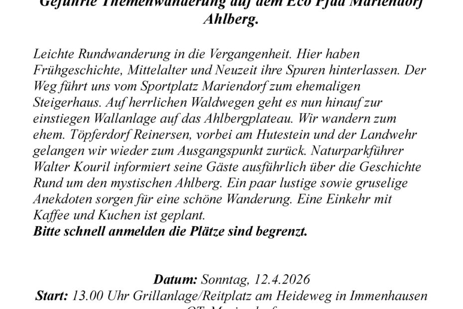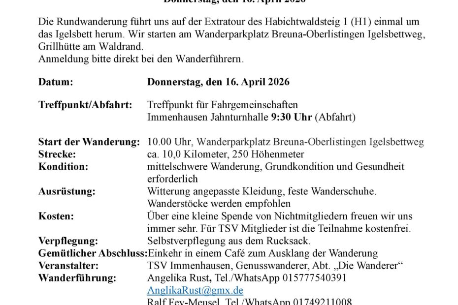Die TSV Immenhausen lädt zur nächsten Genusswanderung ein. Am Donnerstag, den 16. April 2026, führt die Tour auf der Extratour H1 rund um das Igelsbett.… Weiterlesen »Genusswanderung: Rund um das Igelsbett