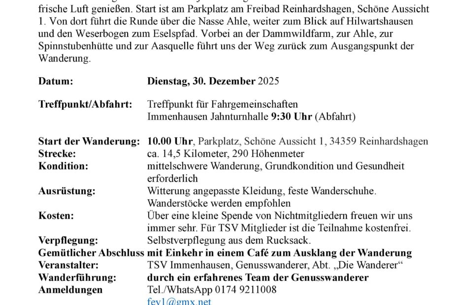 Sonntag, 4. Januar 2026 Die Wanderer der TSV Immenhausen laden gemeinsam mit dem Naturpark Reinhardswald zur ersten Tour des neuen Jahres ein. Start ist am… Weiterlesen »Wanderung der guten Vorsätze