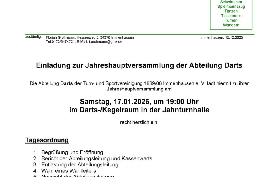 Bei uns findest Du neben den klassichen „nordhessischen“ Sportarten wie Fußball, Handball, Tischtennis oder Turnen auch Darts, Judo, Freizeitsport und Tanzen. Ebenfalls kannst du dich bei Kegeln, Leichtathletik, im Spielmannszug oder beim Wandern aktiv betätigen. Und da Immenhausen ein Schwimmbad hat, gibt es bei uns natürlich auch eine Abteilung Schwimmen. Falls dir diese Abteilungen noch nicht zusagen, gibt es noch zahlreiche Fitness- und Gesundheitskurse wie Zumba, Power Pump, Yoga oder Bodyworkout. Möchtest du dein Rehaprogramm bei uns absolvieren sprich uns in der Geschäftsstelle (Telefon: 05673-3400) an oder schreibe uns per E-Mail: .