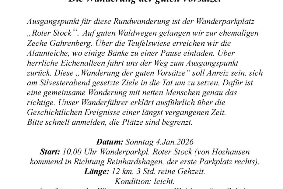 Dienstag, 30. Dezember 2025 Nach den Feiertagen wird wieder durchgeatmet und losgewandert.Unsere traditionelle Jahresabschlussrunde führt uns auf einem schönen Rundweg unter dem Mondberg bei Reinhardshagen… Weiterlesen »Genusswanderung: „Der Bauch-Muss-Weg“