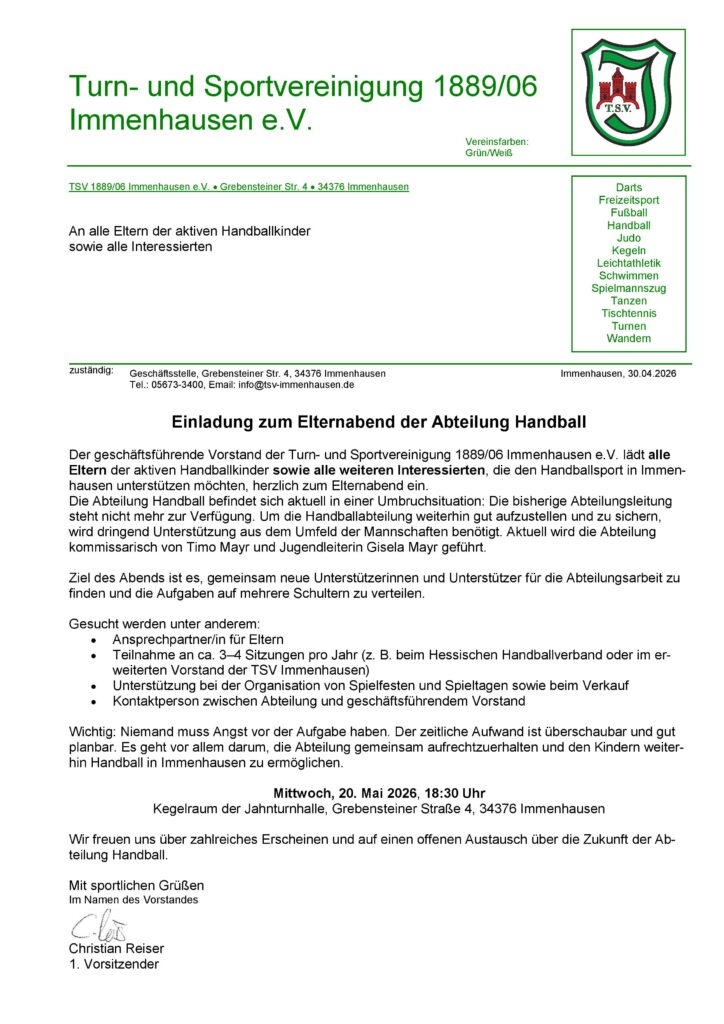 Die TSV Immenhausen lädt alle Eltern der Handballkinder sowie alle Interessierten herzlich zum Elternabend ein.