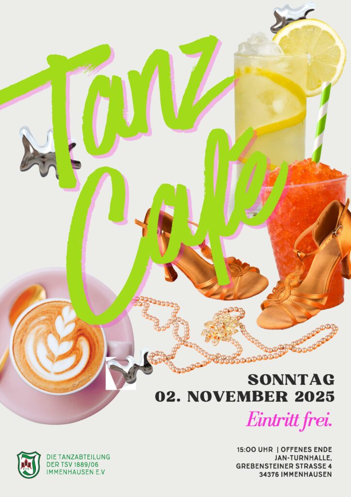 Am 2. November lädt euch die Abteilung Tanzen der TSV Immenhausen herzlich zu ihrem diesjährigen Tanz-Café in die Jahnturnhalle ein. Ab 15:00 Uhr erwartet euch ein Nachmittag voller Musik, Bewegung und Genuss.