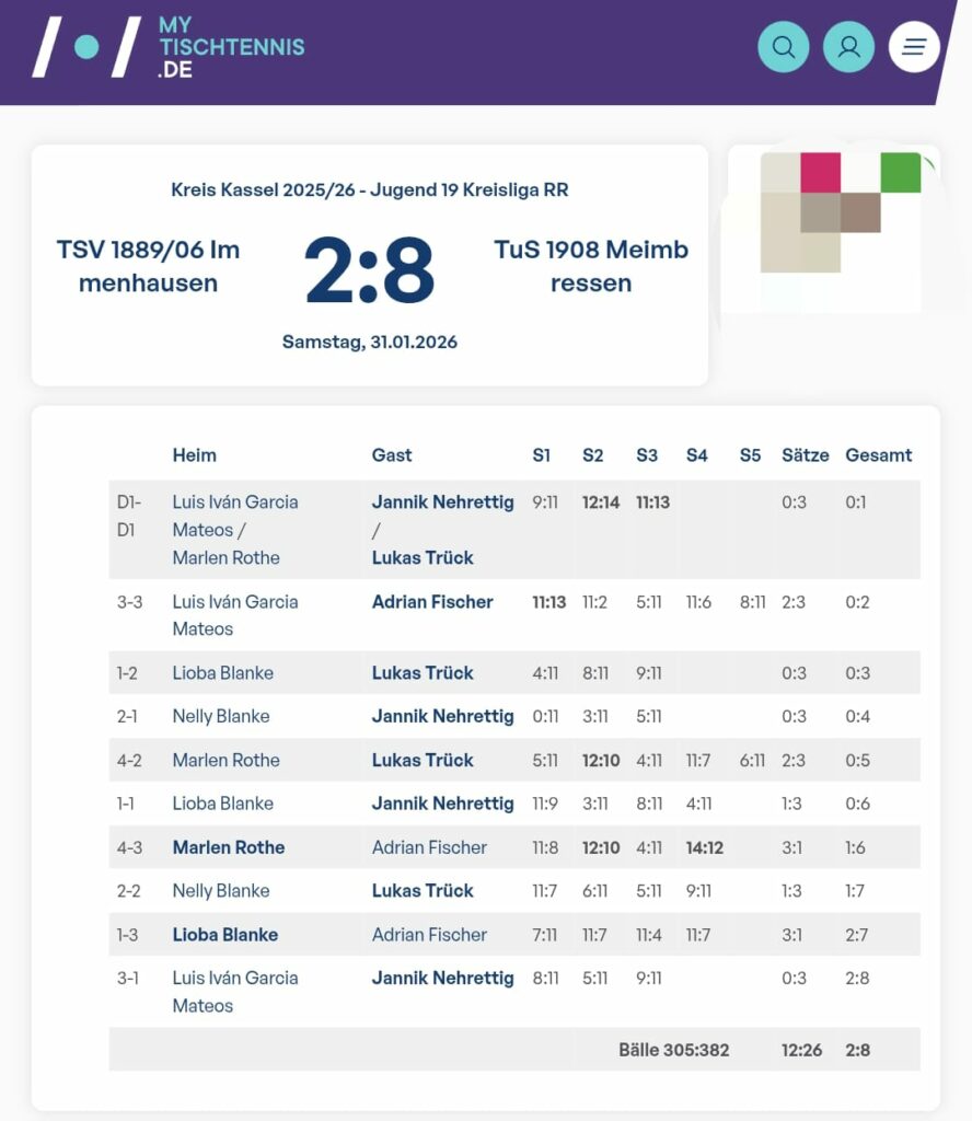 Am Samstag startete unsere J19 in die Rückserie. Gegen den wohl stärksten Konkurrenten der Gruppe war die Aufgabe alles andere als leicht. Lioba und Marlen sorgten mit zwei starken Einzelsiegen für echte Achtungserfolge. Insgesamt konnte das Team gut mithalten und zeigte phasenweise starke Ballwechsel, am Ende stand jedoch eine 2:8-Niederlage gegen Meimbressen.