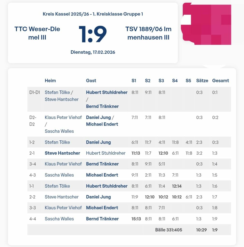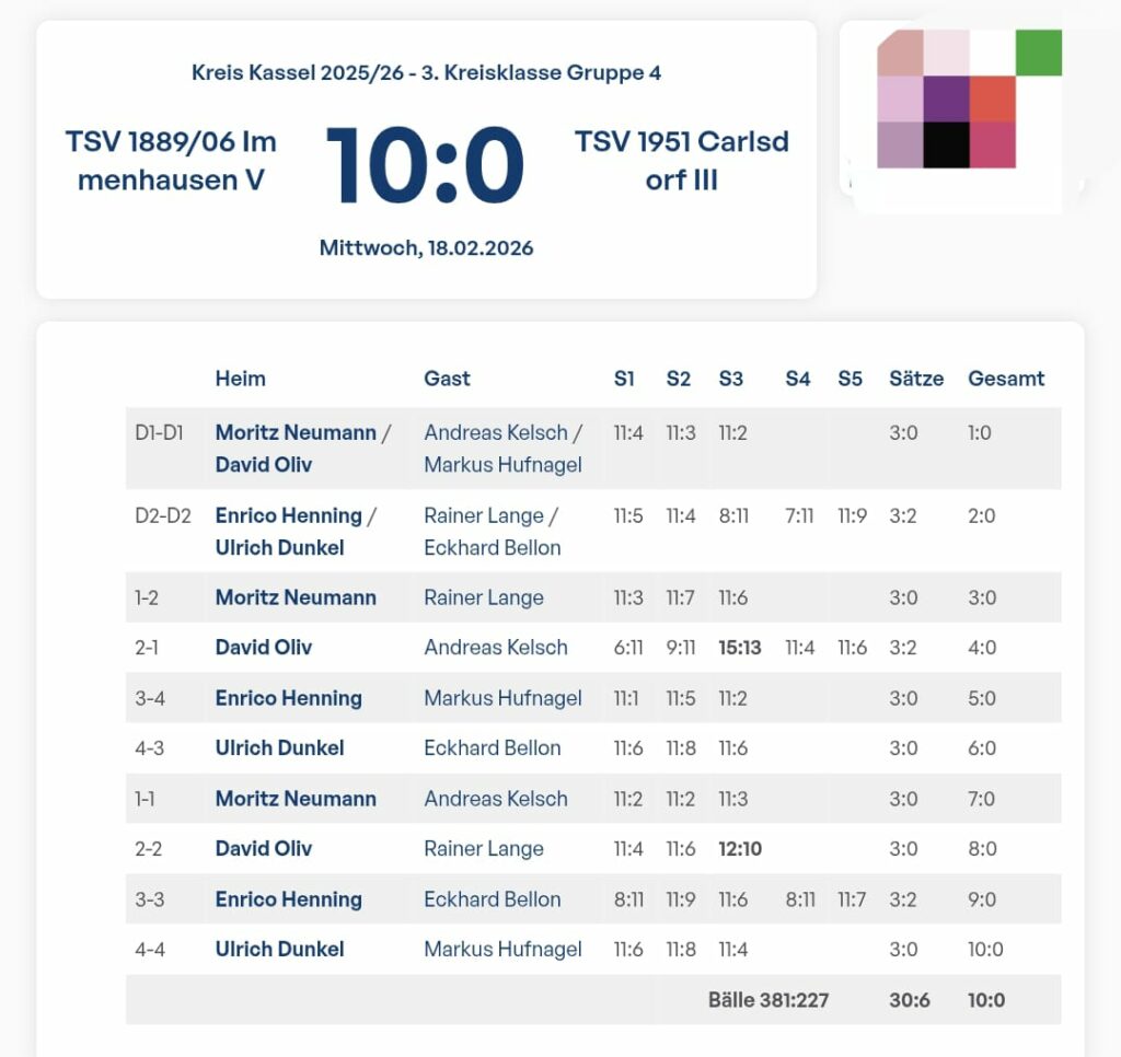 Am Dienstag zeigte unsere Dritte beim Auswärtsspiel in Bad Karlshafen eine konzentrierte Leistung und sicherte sich einen souveränen 9:1 Erfolg.