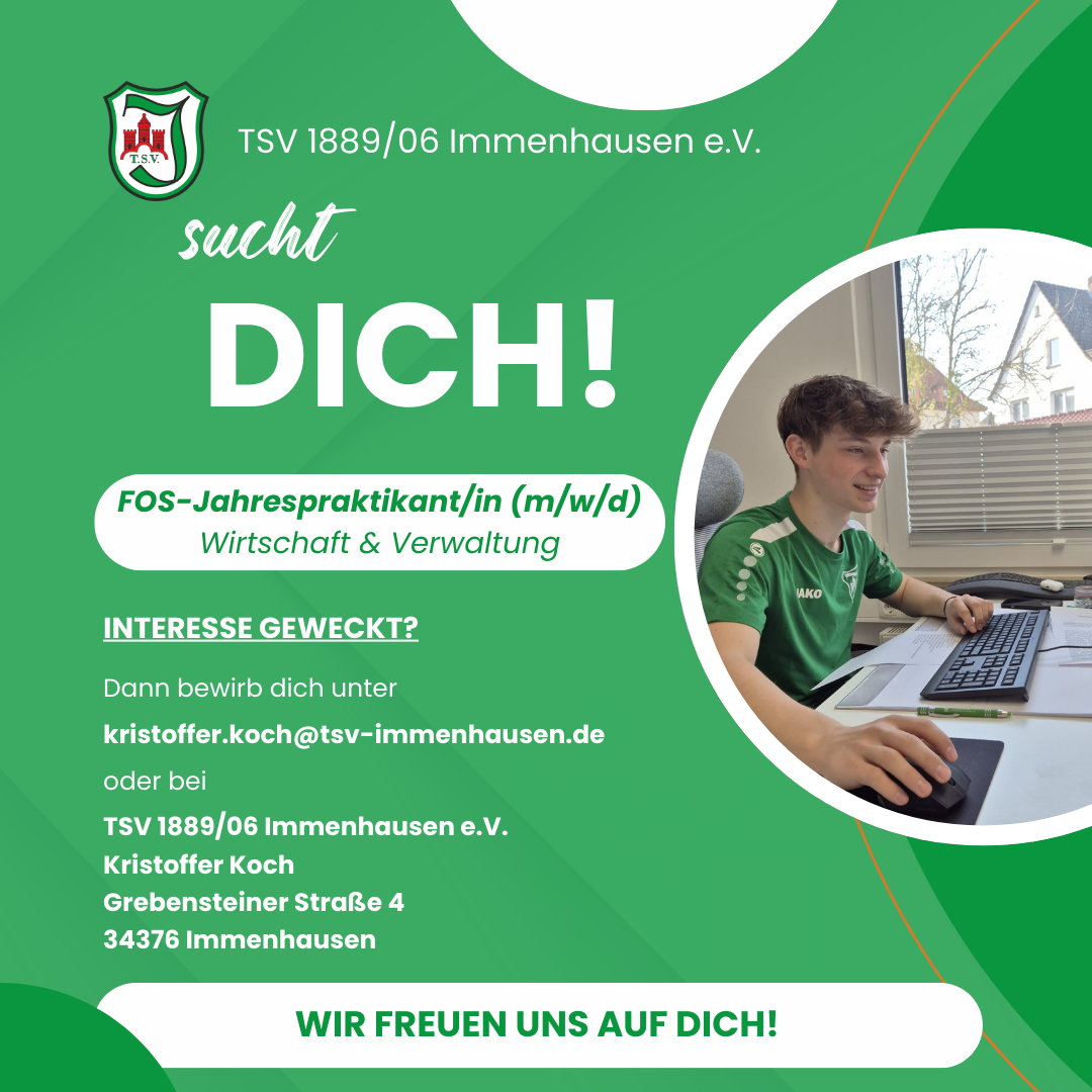 Ab dem 01.08.2026 suchen wir eine/n FOS-Jahrespraktikant/in (m/w/d) im Bereich Wirtschaft & Verwaltung für unsere Geschäftsstelle bei der TSV Immenhausen.