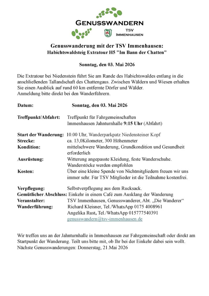Am Sonntag, 03. Mai 2026 geht’s mit der TSV Immenhausen auf eine abwechslungsreiche Tour rund um Niedenstein. Freut euch auf weite Ausblicke über den Chattengau und eine Mischung aus Wald- und Wiesenwegen.