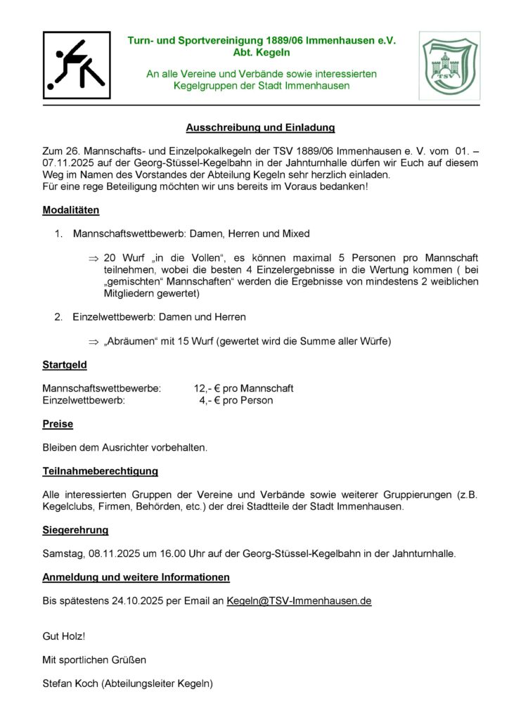 Vom 01. bis 07. November 2025 lädt die Abteilung Kegeln der TSV 1889/06 Immenhausen e….