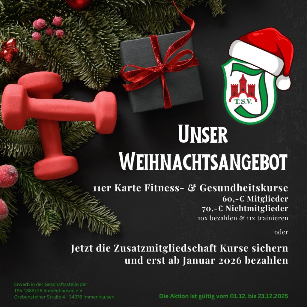 Die TSV 1889/06 Immenhausen e.V. bietet vom 29.11. bis 20.12.2024 ein besonderes Weihnachtsangebot: Eine 11er…