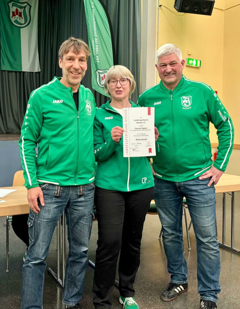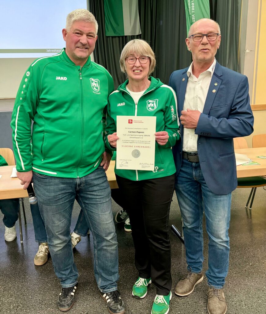 Ein ganz besonderer Punkt war die Ehrung von Carmen Popovic, die seit 42 Jahren Verantwortung in der Abteilung Turnen, als auch im TSV Vorstand (26 Jahre), übernommen hat. Zusätzlich war sie noch drei Jahrzehnte eine engagierte Übungsleiterin. Dafür wurde sie vom Deutschen Turnerbund und ebenso vom Landessportbund, ausgezeichnet.