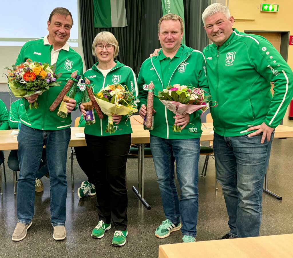 Nach vielen Jahren aus dem Vorstand ausgeschieden, von links, Rainer Schütz (Sportwart), Carmen Popovic (stellvertretende Schriftführerin), Tobias Römer (stellvertretender Sportwart) – den Dank und Präsente überreichte der Vorsitzende Christian Reiser