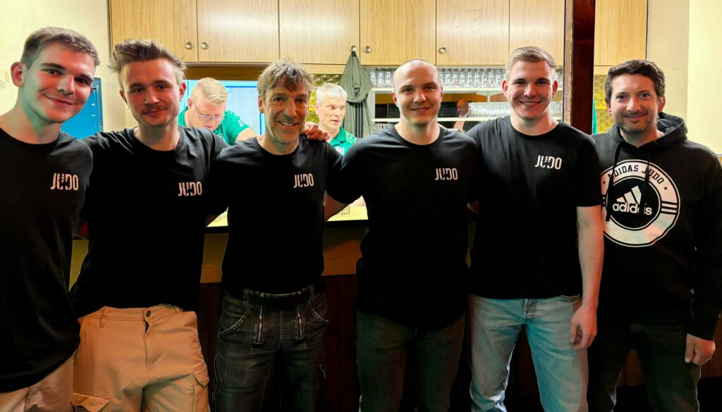 Helfer im Saal, vom Judo, Johannes Desel, Karlo Hobein, Tobias Güttler, Henrik Kuhlmey, Max Desel, Fabian, im Hintergrund die Thekenmannschaft vom Tischtennis mit Christian Greif, Bernd Trenkner und Robert Schwedler, außerdem bewirteten die 💚🤍Hühner die Besucher mit Brötchen
