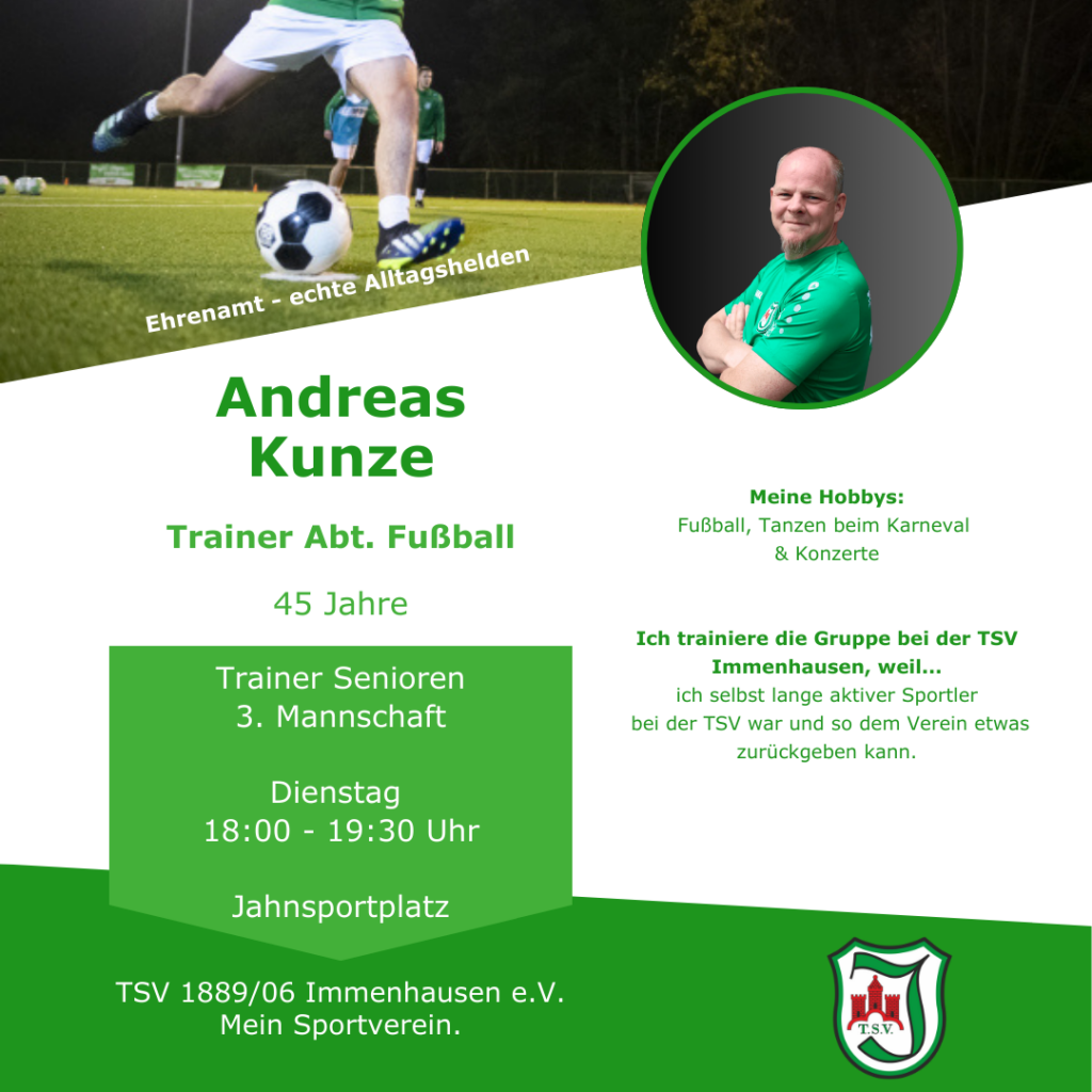 Andreas ist Trainer unserer 3. Mannschaft, die seit dieser Saison wieder fester Bestandteil unserer Fußballfamilie ist. Mit viel Einsatz und Leidenschaft begleitet er das Team an der Seitenlinie und trägt dazu bei, dass unsere grün-weiße Fußballfamilie weiter wächst.